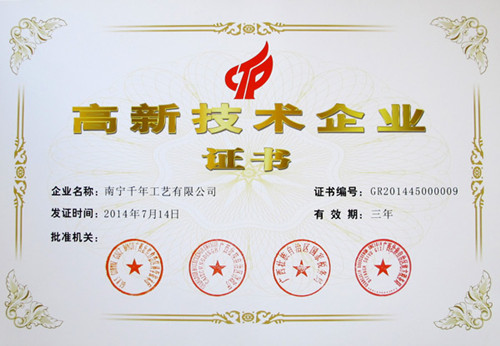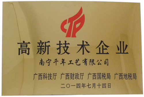 (本網(wǎng)訊) 熱烈慶祝集團公司------千年工藝獲得了由廣西科技廳、廣西財政廳、廣西國稅局、廣西地稅局聯(lián)合頒發(fā)的“高新技術(shù)企業(yè)證書”,成為廣西2014年首批國家級高新技術(shù)企業(yè)之一。